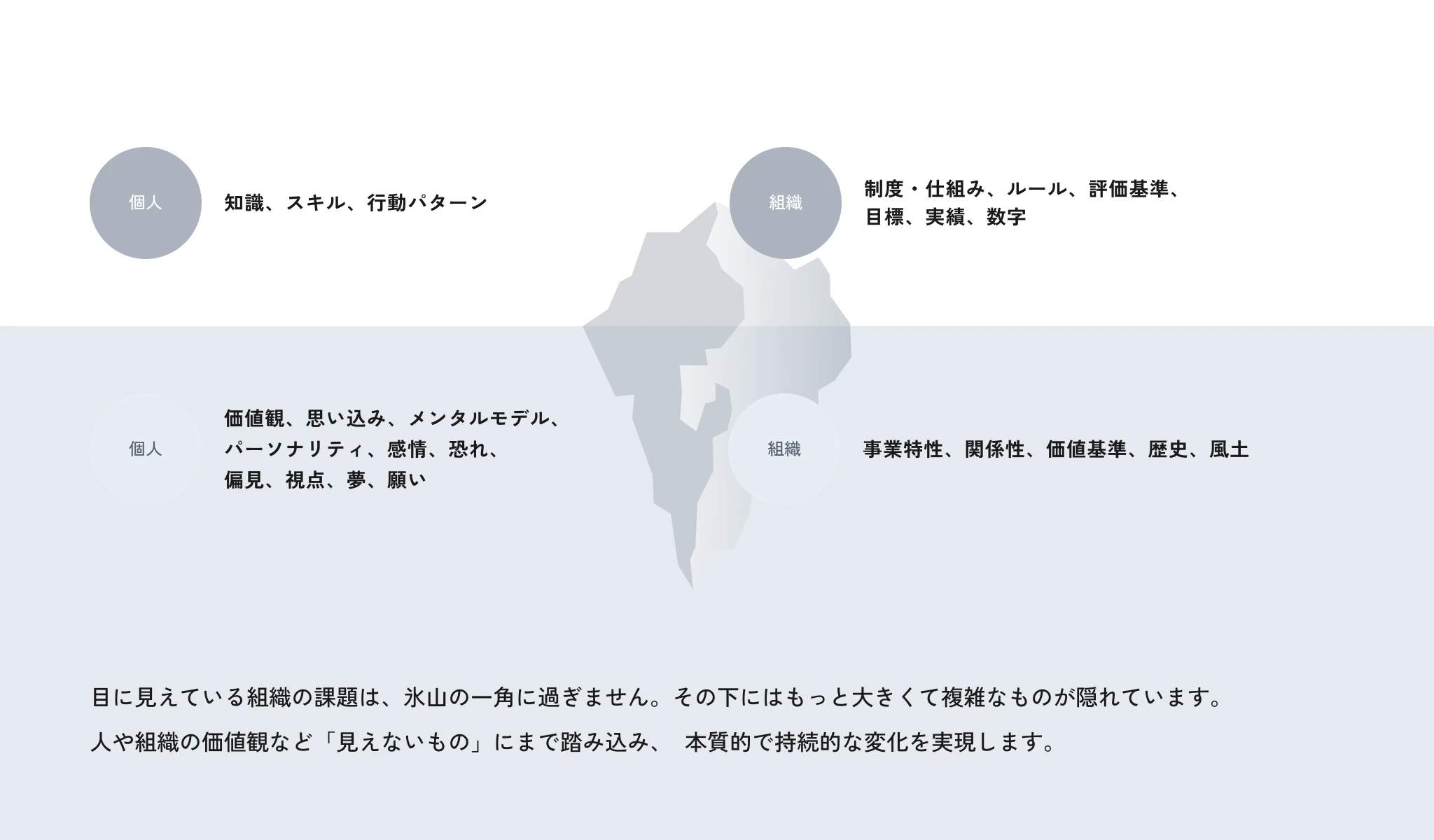 私たちは、一人ひとりの内面に寄り添いながら、関係性や組織全体に働きかけることを大切にしています。変化の速い時代に必要なのは、外側からの解決ではなく、内側からの気づきと行動の変容です。手法ではなく「あり方」に根ざした支援を重視しています。